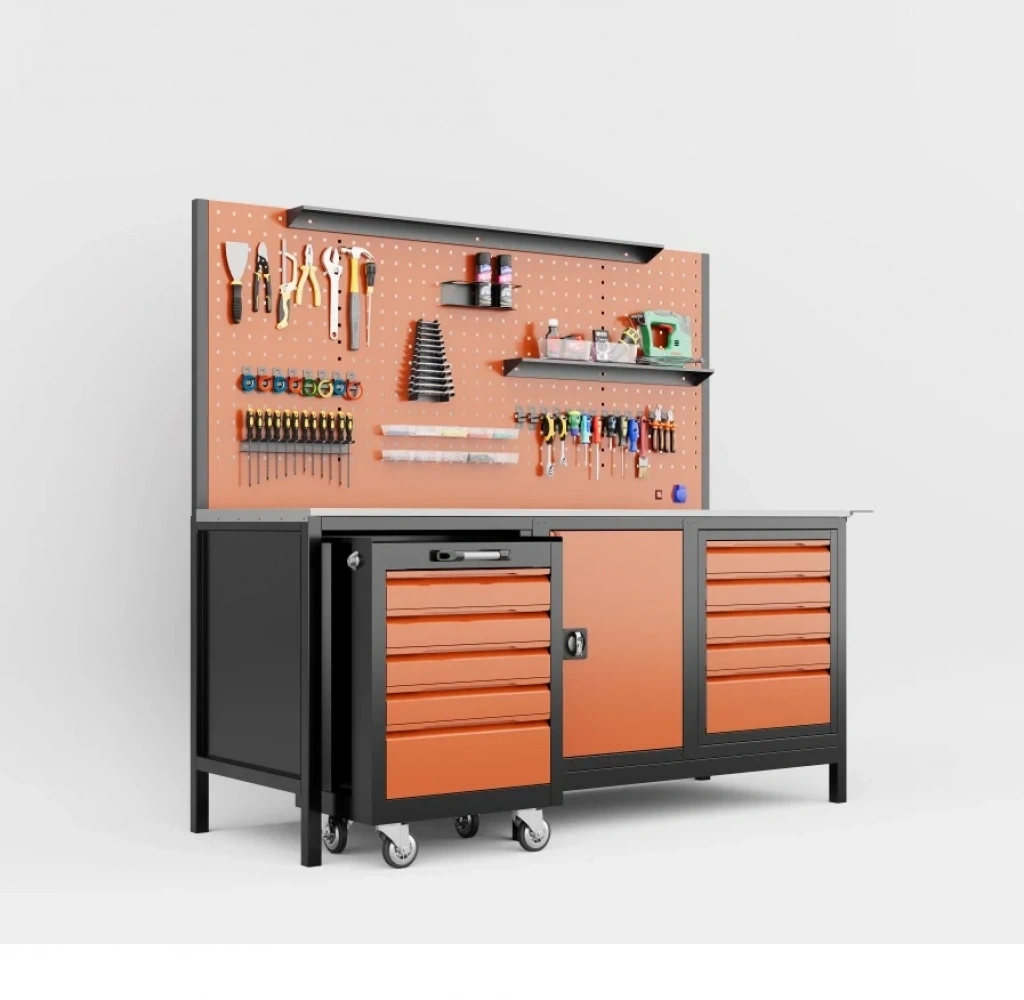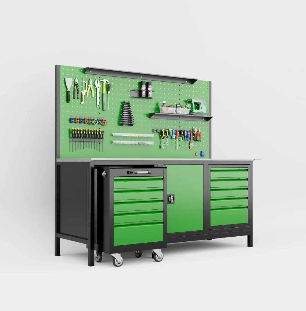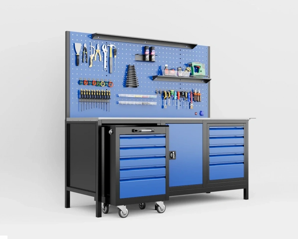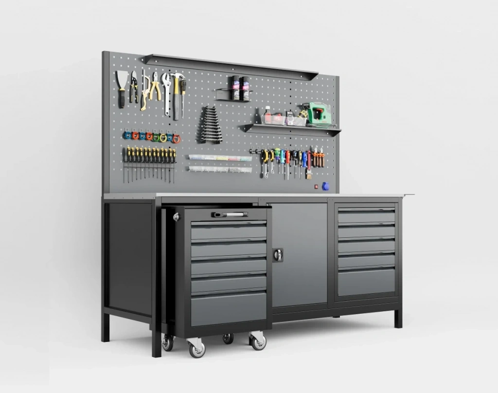 Sabit çalışma tezgâhı ile birlikte hareketli 5 çekmeceli takım arabası sunarak, düzenli ve pratik bir çalışma alanı oluşturur. Mobil ekipman ihtiyacı olan servis ve atölyeler için ideal bir çözümdür.