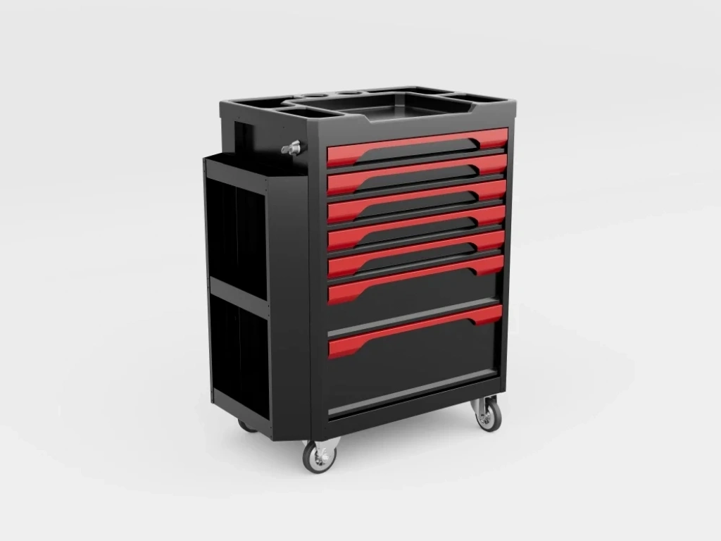 7 çekmeceli yanlıklı takım arabası, yoğun atölye ve servis ortamlarında düzenli, pratik ve güvenli çalışma sağlamak üzere tasarlanmıştır. Yan aksesuar alanları sayesinde el aletleri ve sarf malzemeleri kolay erişilebilir şekilde konumlandırılabilir.