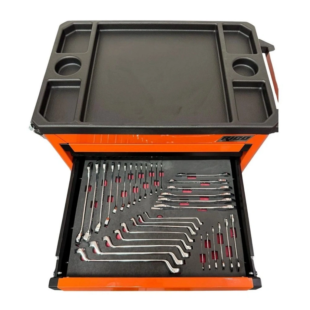 | 1. Çekmece | Lokma Takımları ve Aksesuarları: 1/4″ ve 1/2″ Lokma setleri (standart ve derin), Cırcır Kolları (90 diş), Uzatmalar, Mafsallar, T-Kollar, Bits Lokmalar, Torx ve E Lokma setleri. |